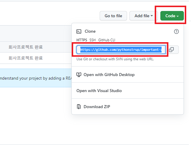 아래 사진과 같이 code 버튼을 이용하면 쉽게 원격저장소 주소를 얻을 수 있다.