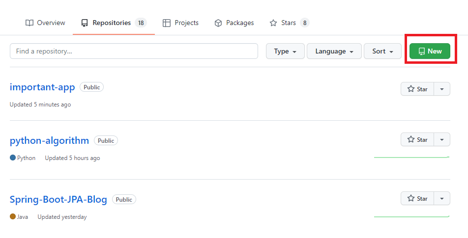 일단 깃허브에 로그인해서 Repositories에 들어간다. (깃허브 주소 : https://github.com/ )