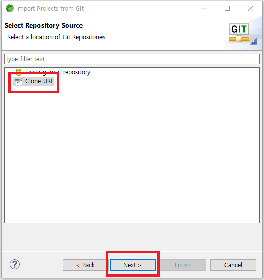 Clone URI 를 선택하고 Next를 누른다.