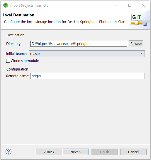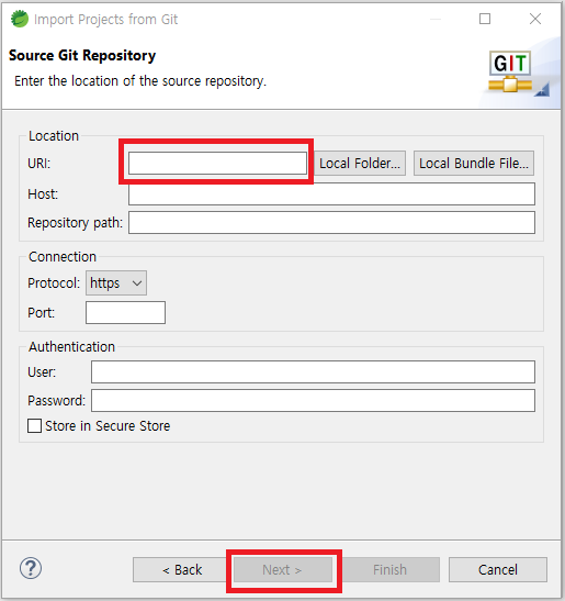 URI에 깃허브에서 복사한 주소를 넣어준다음 Next를 누르고 또 Next를 눌러주자.