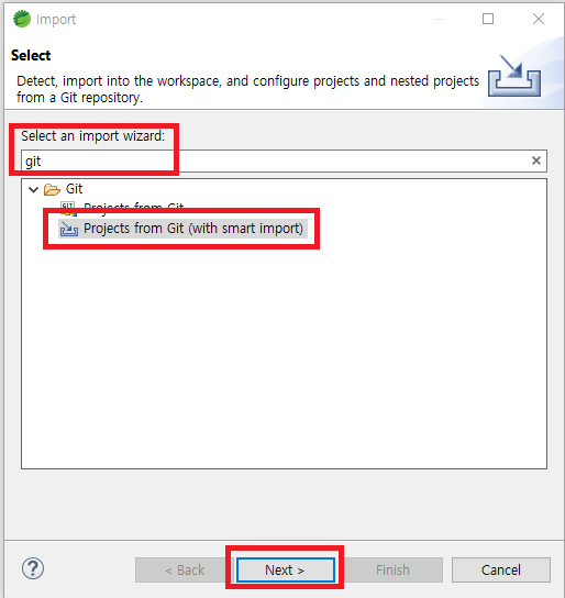 "git" 이라고 검색하면 Projects from Git (with smart import) 를 선택해 Next를 클릭하자