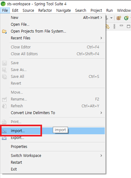 STS툴로 가보자. 메뉴에서 File > Import 를 선택하자