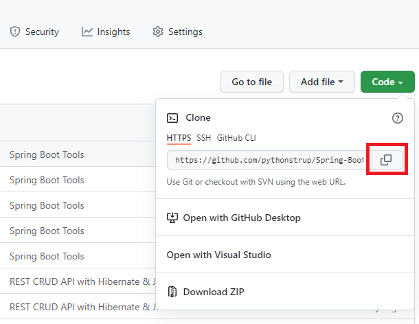 깃허브에서 원하는 레포지토리로 들어가 원격저장소의 주소를 복사한다.