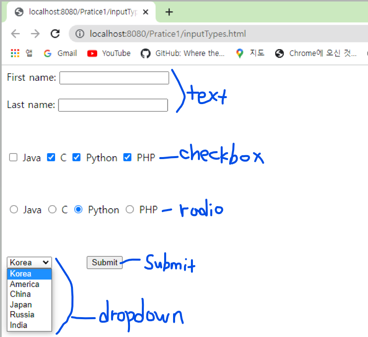 HTML 에서 많이 쓰이는 <input> 태그의 타입에는 5가지가 있다.