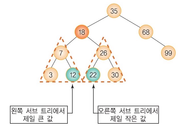 - 마지막 경우: 삭제노드와 가장 비슷한 값을 가진 노드를 삭제노드 위치로 가지고 온 뒤 그 노드는 삭제한다. 가장 비슷한 값이란? 왼쪽 서브 트리에서 제일 큰 값 또는 오른쪽 서브 트리에서 제일 작은 값이다.