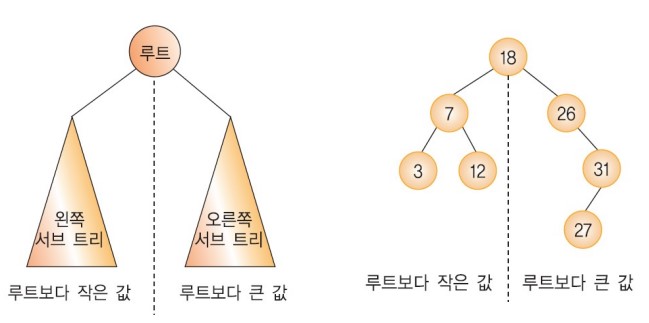 - 오른쪽 서브 트리의 키들은 루트의 키보다 크다.