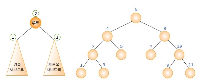 - 왼쪽 자손, 루트, 오른쪽 자손 순으로 방문한다.