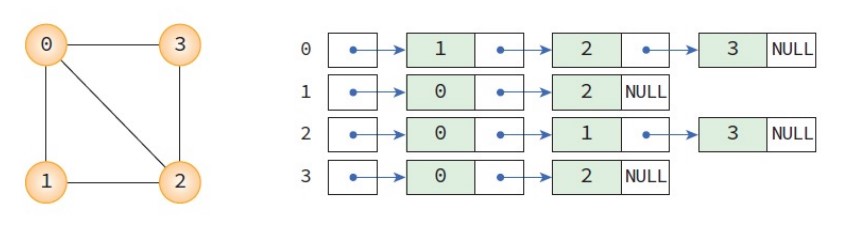 인접 리스트(adjacency list)는 각 정점에 인접한 정점들을 연결리스트로 표현하는 방법으로 많이 사용하는 방법은 아니다. 간선의 수가 적은 희소그래프에 적합하다. 시간복잡도는 O(n + e)이다.