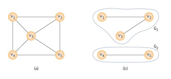 - 연결 그래프(connected graph): 무방향 그래프 G에 있는 모든 정점쌍에 대하여 항상 경로가 존재한다면 G는 연결되었다고 하며, 연결 그래프라고 부른다. 아래의 (a)는 연결 그래프이고 (b)는 비연결 그래프이다.