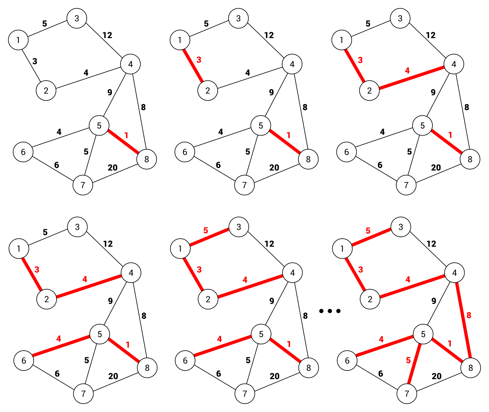 아래 그림은 위 알고리즘을 적용해 그래프를 최소 비용 신장 트리를 만드는 과정을 보여준다.