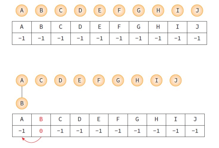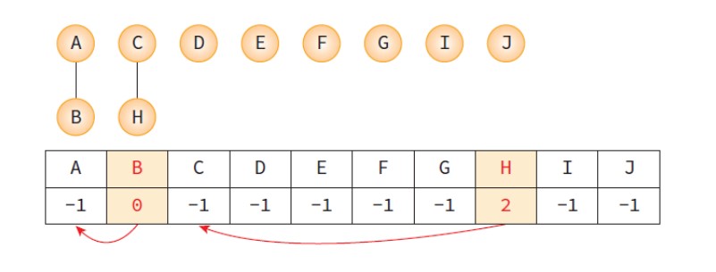 아래 그림은 연결이 전혀 없는 정점에서 위 알고리즘의 union함수를 사용한 것으로, union(A, B)와 union(C, H)를 실행했을 때의 그림이다.