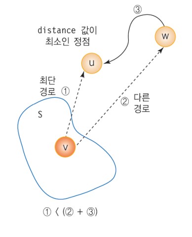 - 그러면 정점 v에서 정점 u까지의 정점 v에서 정점 w까지의 거리 ②와 정점 w에서 정점 u로 가는 거리 ③을 합한 값이 된다.