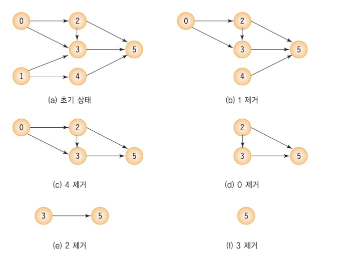 출력 결과: 정점1 -> 정점4 -> 정점0 -> 정점2 -> 정점3 -> 정점5