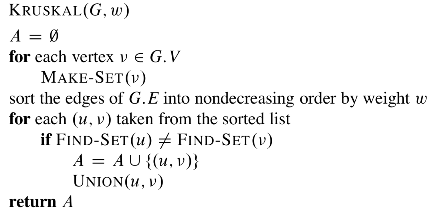 Kruskal 알고리즘은 탐욕법(Greedy Method: 그리디 알고리즘)를 사용한다. 여기서 그리디 알고리즘이란 선택의 순간마다 당장 눈앞에 보이는 최적의 상황만을 쫓아 최종적인 해답에 도달하는 방법이다. 선택의 순간에는 그 해가 최적이지만 최종적인 해답이 반드시 최적이라는 보장은 없다. 그러므로 탐욕법은 항상 최적으 해답을 주는지 검증이 필요한데, Kruskal 알고리즘은 최적의 해답을 주는 것이 증명되었다. 아래는 이 알고리즘의 pseudo-code이다.