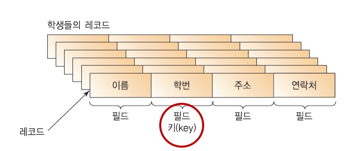 정렬시켜야할 대상을 레코드(record)라고 부르고, 이 레코드는 다시 필드(field)라고 하는 단위로 나누어진다. 여러 필드 중에서 특히 레코드를 식별해주는 역할을 하는 필드를 키(key)라고 한다. 정렬이란 키값을 기준으로 순서를 재배열하는 것이다.