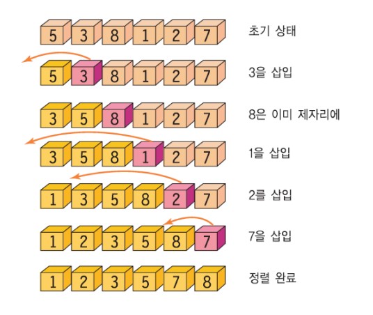 - 모든 단계에서 앞에 있는 자료를 전부다 오른쪽으로 이동시켜야한다.