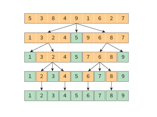 퀵 정렬은 평균적으로 가장 빠른 수행 속도를 가진 정렬 방식이다. 퀵 정렬도 합병 정렬과 마찬가지로 분할 정복 기법을 사용한다. 전체 리스트를 2개의 부분 리스트로 분할하고, 각각의 부분리스트를 다시 퀵 정렬한다. 퀵 정렬에서는 피봇의 역할이 중요한데 피봇을 기준으로 정렬를 계속해서 반복한다. 그 자세한 과정은 아래와 같다.