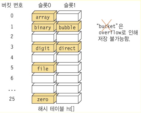 알파벳 앞자리에 의해 키가 결정된다고 가정해보자. a일 때는 0이고 b이면 1인 식이다. 입력데이터가 array, binary, bubble, file, digit, direct, zero, bucket 순이라고 할 때 아래 해시테이블과 같이 슬롯이 2칸인 경우, bucket이 오버플로우로 인해 저장되지 못하는 것을 확인할 수 있다.