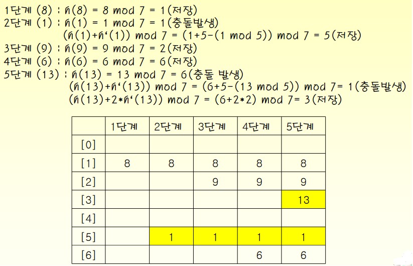 충돌이 발생했을 때 h(k) -> h(k)+step -> h(k)+2*step -> ... 순으로 진행되며 빈 버킷을 찾을 것이다. 크기가 7인 해시테이블에서 (8, 1, 9, 6, 13)을 입력하는 예시는 아래와 같다.