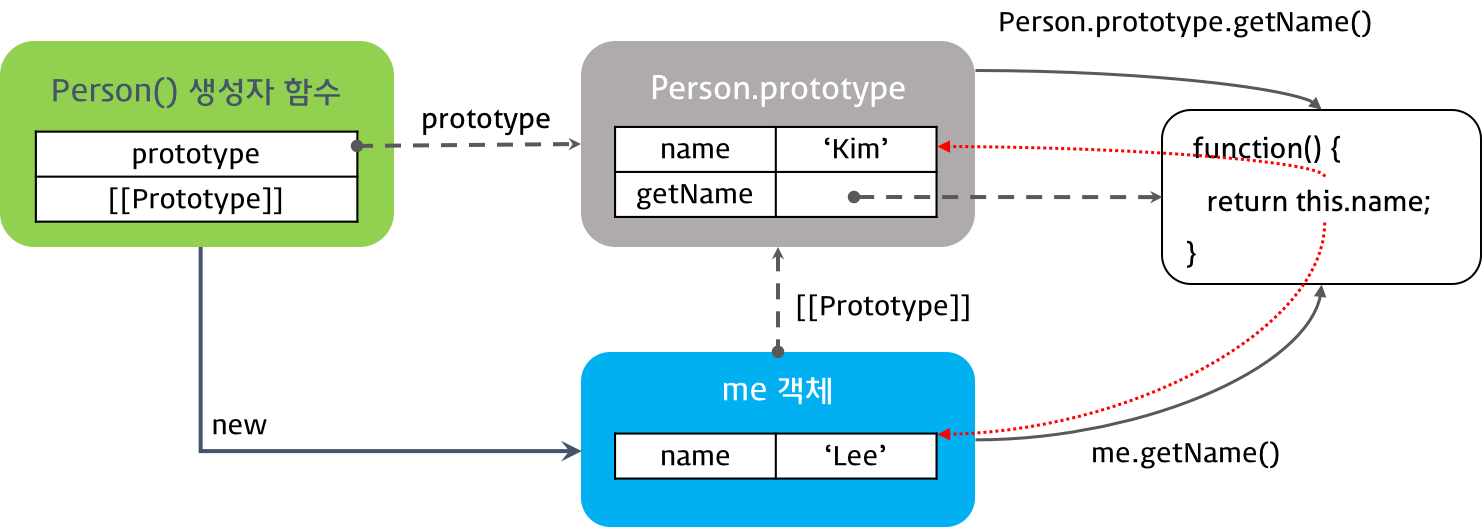 또한, 프로토타입 객체도 메소드를 가질 수 있다. 프로토타입 객체 메소드 내부에서 사용된 this 도 일반 메소드 방식과 마찬가지로 해당 메소드를 호출한 객체에 바인딩된다.