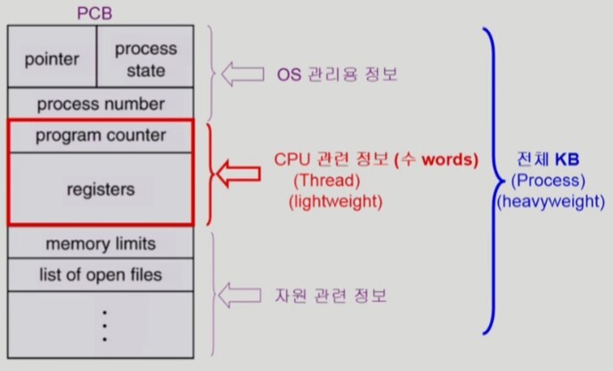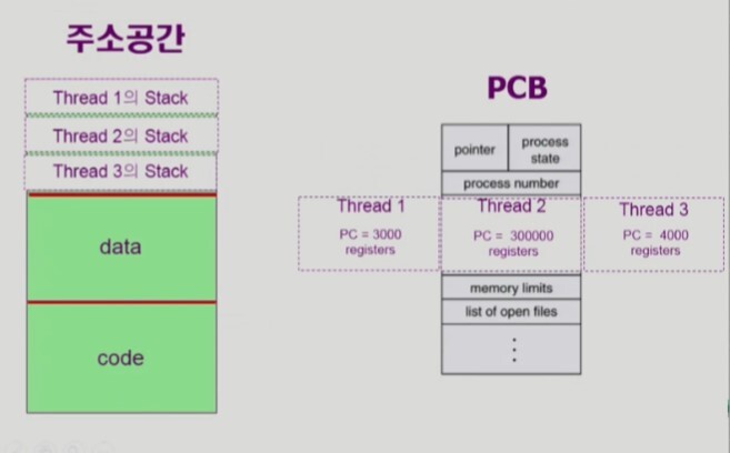 - PCB에서 사용하는 각종 자원과 프로세스 상태 등을 공유하는 대신 CPU 수행과 관련된 정보는 각자 Thread로 가지고 있는다. PC(Program Counter)와 register, stack 등이 그 내용이다.