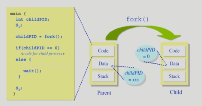 - fork 함수는 부모 프로세스에게는 자식프로세스의 PID를 반환하며 자식 프로세스에게는 0을 반환한다.