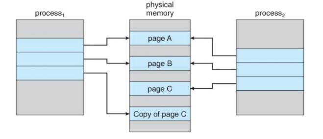 Copy On Write는 위의 fork()와 exec()에서 사용된다. COW는 리소스가 복제되었지만 수정되지 않은 경우 새 리소스를 만들 필요 없이 복사본과 원본이 리소스를 공유하고, 복사본이 수정되었을 때만 새 리소스를 만드는 리소스 관리 기법을 말한다. 간단히 말하면 write인 exec()가 발생했을 때 copy를 진행하는 것이다.