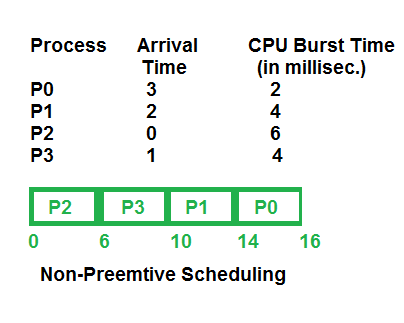 평균 대기 시간을 최소화하기 위해 CPU 점유 시간이 가장 짧은 프로세스에 CPU를 먼저 할당하는 방식이다. 각 프로세스와 다음의