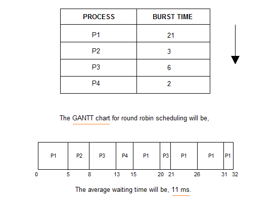 할당 시간이 지나면 프로세스는 준비 큐의 끝에 가서 다시 줄을 서게 된다. n개의 프로세스가 ready queue에 있고 할당 시간이 q time unit인 경우 각 프로세스는 최대 q time unit 단위로 CPU 시간의 1/n을 얻기 때문에 어떤 프로세스도 (n-1)*q time unit 이상 기다리지 않는다는 특징이 있다. 문맥 전환의 오버헤드가 큰 반면, 응답시간이 짧아지는 장점이 있어 실시간 시스템에 유리하다.