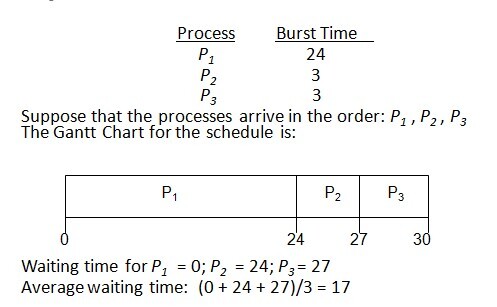 먼저 자원 사용을 요청한 프로세스에게 자원을 할당해 주는 방식의 스케줄링 알고리즘이다. 큐의 원리와 같다. 어떤 프로세스가 앞에 오느냐에 따라 큰 영향을 받는 스케줄링이다.