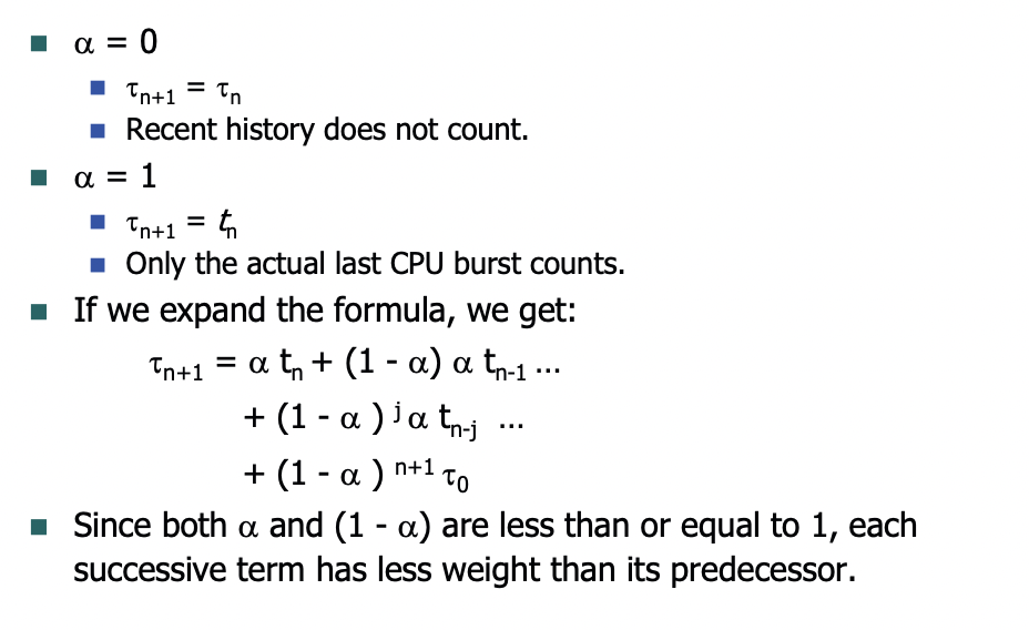 - CPU burst time 예측 방법: 지수 평활법 exponential averaging