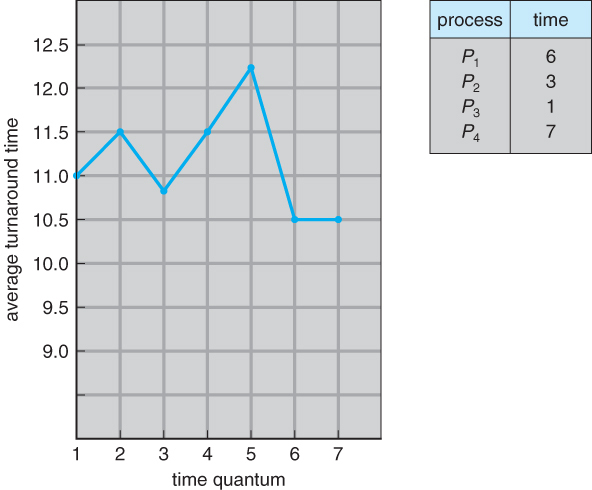 - time quantum의 단위에 따라서 turnaround 성능이 달라진다.