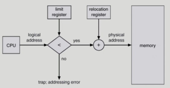 - relocation register와 limit register, 2개의 레지스터를 이용해 주소변환을 진행한다. virtual memory(logical memory)가 올라가 있는 위치에 logical memory 상에 존재하는 해당 번지의 위치를 더해주면 값을 얻어올 수 있다.