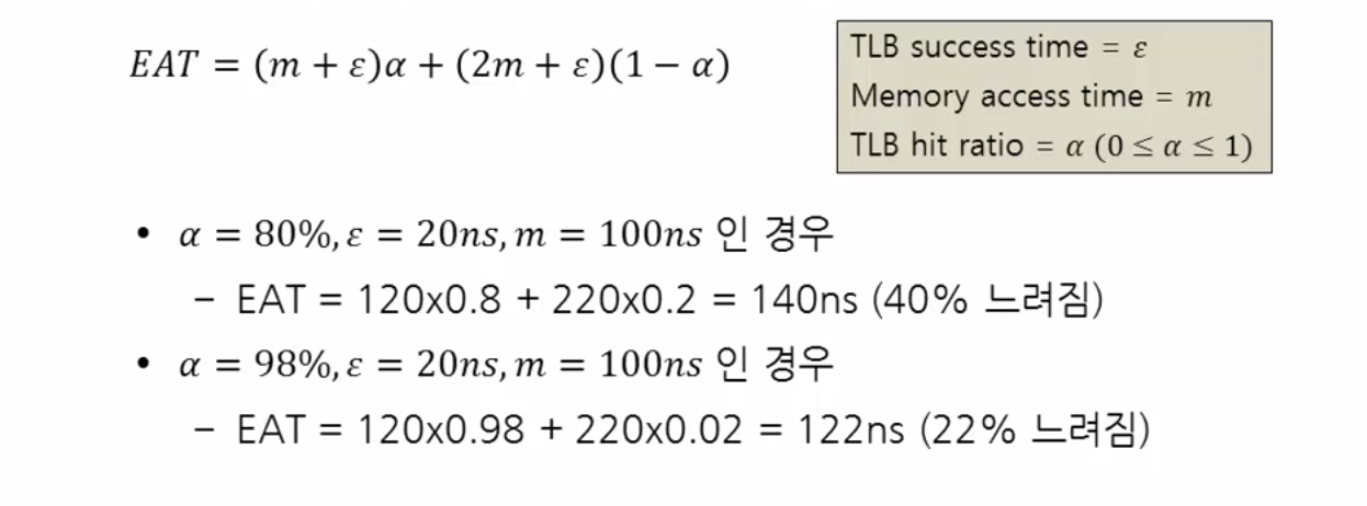 TLB전체를 먼저 검색해본다. 주소 변환 정보 중에 캐시에 이미 저장되어 있는 것이 있다면 바로 이용해 주소 변환을 실시한다. TLB는 parallel search, 즉 병렬적으로 탐색이 가능한Associative register를 이용해 구현할 수 있다.TLB는문맥 교환 context switch발생 시 flush 명령을 하여 오래된 데이터를 제거한다. (remove old entry)TLB를 사용할 때 평균 메모리 접근 시간을EAT(Effective Memory-Access Time)라고 한다. 아래과 같은 식으로 구할 수 있다.