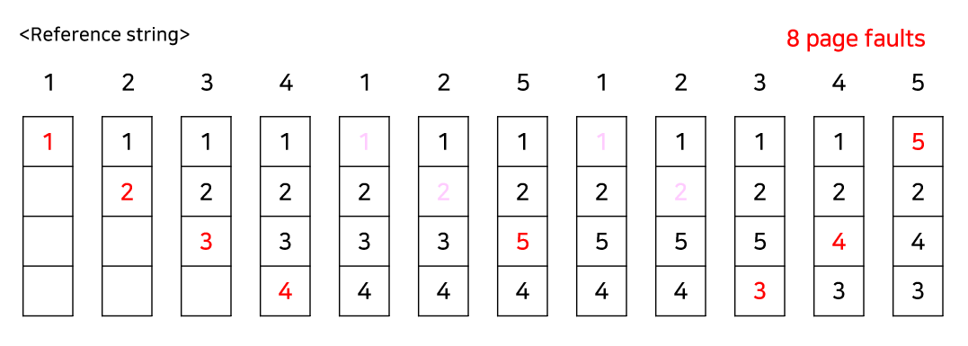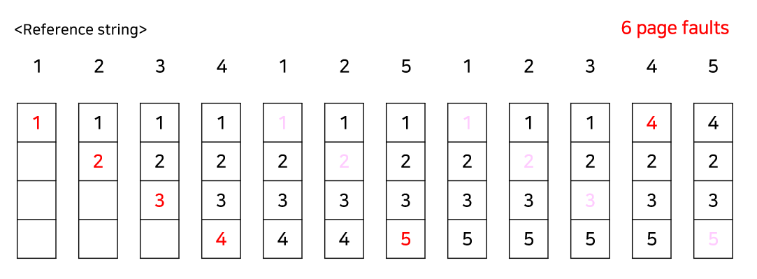 위의 빨간색 숫자는 page fault가 발생한 경우이고, 분홍색은 frame에 이미 존재해서 Hit된 경우, page fault가 발생하지 않은 경우이다. Optimal algorithm은 항상 최적의 해를 가지므로 위와 같은 reference string이 주어진 경우 6번 미만의 page fault가 발생하는 방법은 존재하지 않는다.