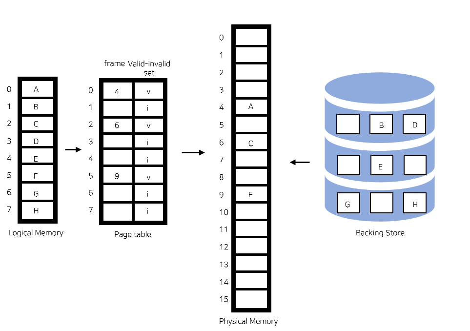 Demand paging은 page table에서 해당 page가 메모리에 있는지를 나타내는 valid-invalid bit를 사용한다. bit가 invalid라면 사용되지 않는 주소 영역이거나 페이지가 물리적 메모리에 없다는 것이다. 처음에는 모든 page entry가 invalid로 초기화되어있고, 주소 변환 시 bit가 invalid로 되어있다면 page fault라는 오류가 발생한다.