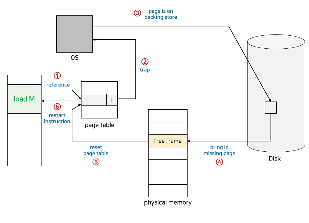 6. 운영체제는 참조된 page를 디스크에서 메모리로 로드(I/O)하고, disk I/O가 끝날 때까지 이 프로세스는 CPU를 빼앗긴다.