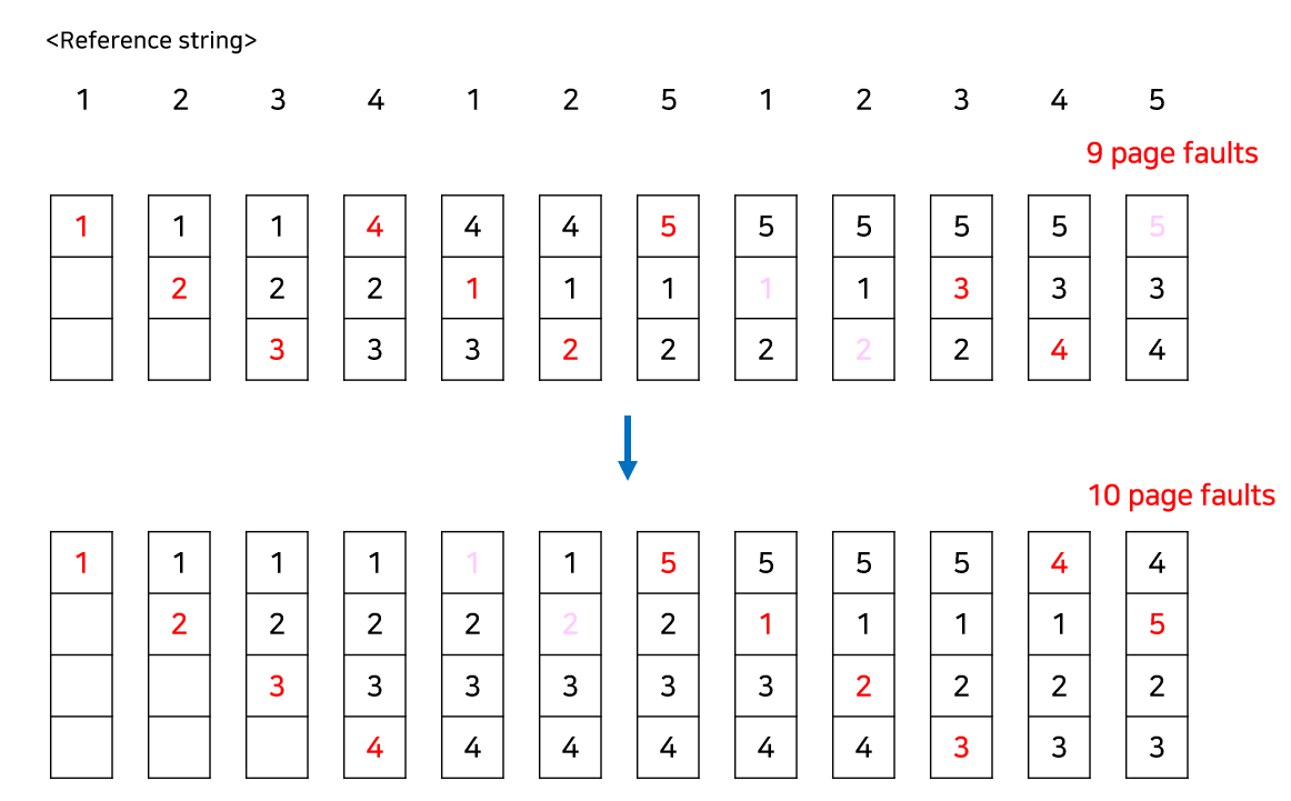 그런데 FIFO는 아래와 같이 frame이 늘어나도 page fault가 감소하지 않고 오히려 늘어나는 경우가 존재한다. 이러한 현상을 Belady's anomaly 현상이라고 한다.