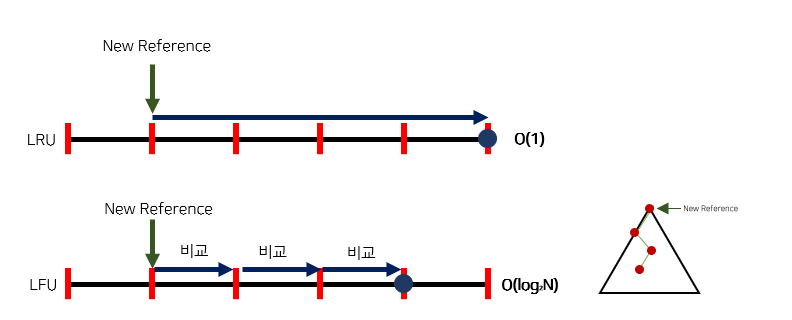 LFU를 LRU처럼 연결 리스트를 이용해서 구현하면 쫓아내야할 page를 찾는데 O(n)의 시간이 걸리게 되어 느리다. 반면, 힙(heap)을 사용하면 최소 빈도를 갖는 page를 찾거나 삽입, 삭제하는데 O(logn)의 시간이 걸리게 되므로 훨씬 효율적으로 구현할 수 있다.