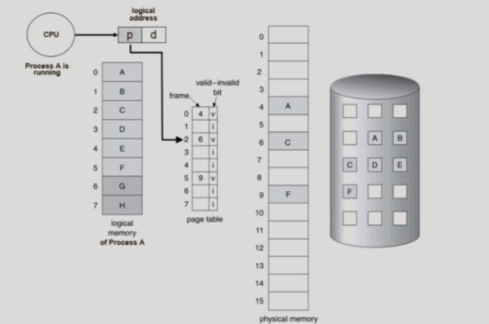 위 그림에서는 CPU가 Process A를 running하고 있다. Process A의 논리 메모리에서 매 순간마다 instruction을 하나씩 읽어서 실행을 할 것이고 page table을 이용해 논리적인 메모리를 물리적인 메모리로 변환하고 그 정보를 읽어와 CPU에 전달할 것이다.
