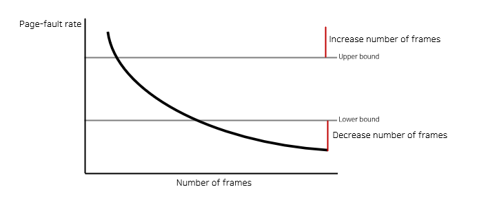 PFF는 page fault의 상한 값과 하한 값을 두고, page fault rate가 상한 값을 넘으면 frame을 더 할당하고, 하한 값보다 낮아지면 할당된 frame 수를 줄이는 방법이다. 만약 빈 frame이 없다면 일부 프로세스를 swap out한다.