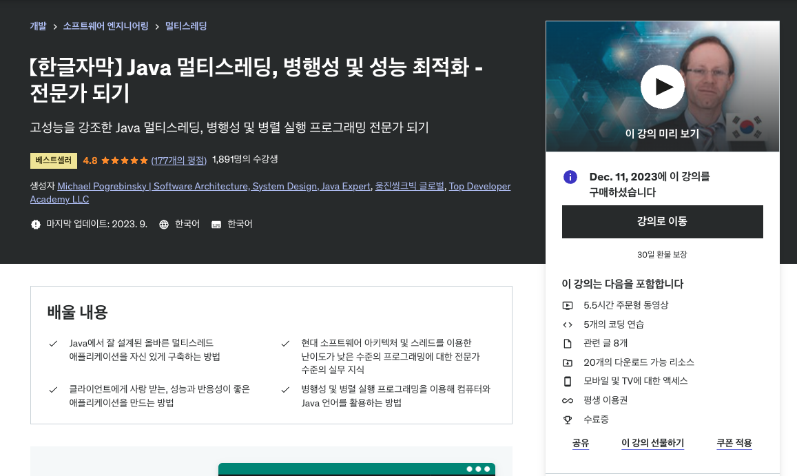 회사에서 이미지 업로드 성능 개선을 위해 스레드를 통한 병렬 처리를 사용하면서 Java와 Spring의 스레드 구현체와 사용법에 대해 공부한 적이 있었다. 그 당시에는 사용법 정도만 알고 있었는데, 강의를 통해 동작 원리와 병행성 문제에 대한 대처 방법 등을 추가로 공부해볼 수 있었다. 개인 프로젝트나 회사에서 성능 개선을 위해 스레드를 사용해본 경험이 있는 개발자라면 해당 강의를 강력 추천하고 싶다.