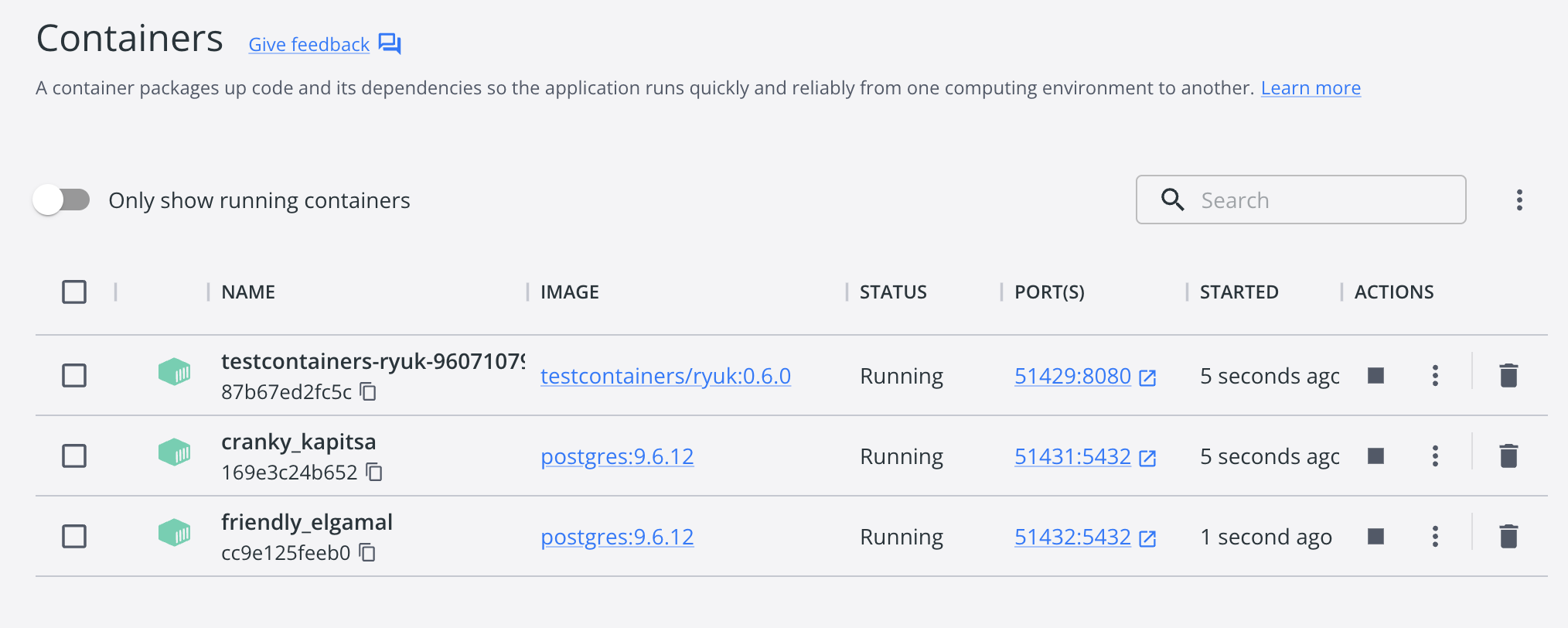 반면 도커 컴포즈를 사용해 테스트 컨테이너를 띄우는 경우 도커 컴포즈 컨테이너가 추가적으로 실행되기 때문에 다른 방식보다 느립니다.