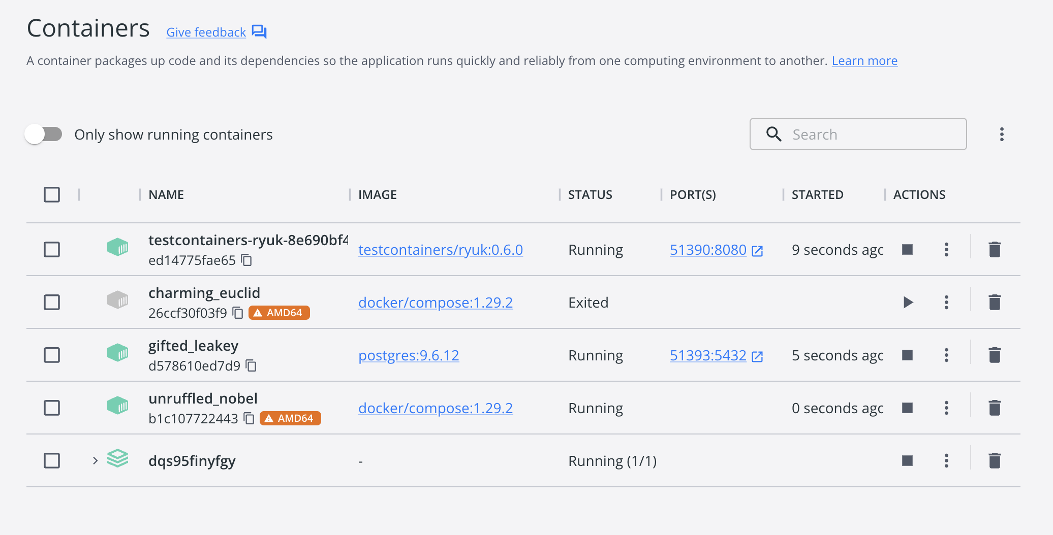 도커 컴포즈를 사용하면 속도가 더 느린데 그 이유는 아래와 같이 추정됩니다. 도커 컴포즈를 사용하지 않는 방법(4-1, 4-2 방식)으로 테스트를 실행하면 testcontainers 컨테이너와 postgres 컨테이너만 있으면 됩니다.