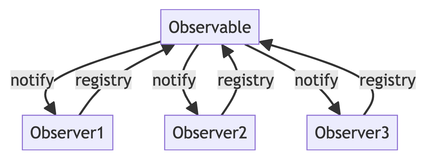 - Observable은 여러 Observer를 등록할 수 있습니다. (registry) (Observable:Observer = 1:N)