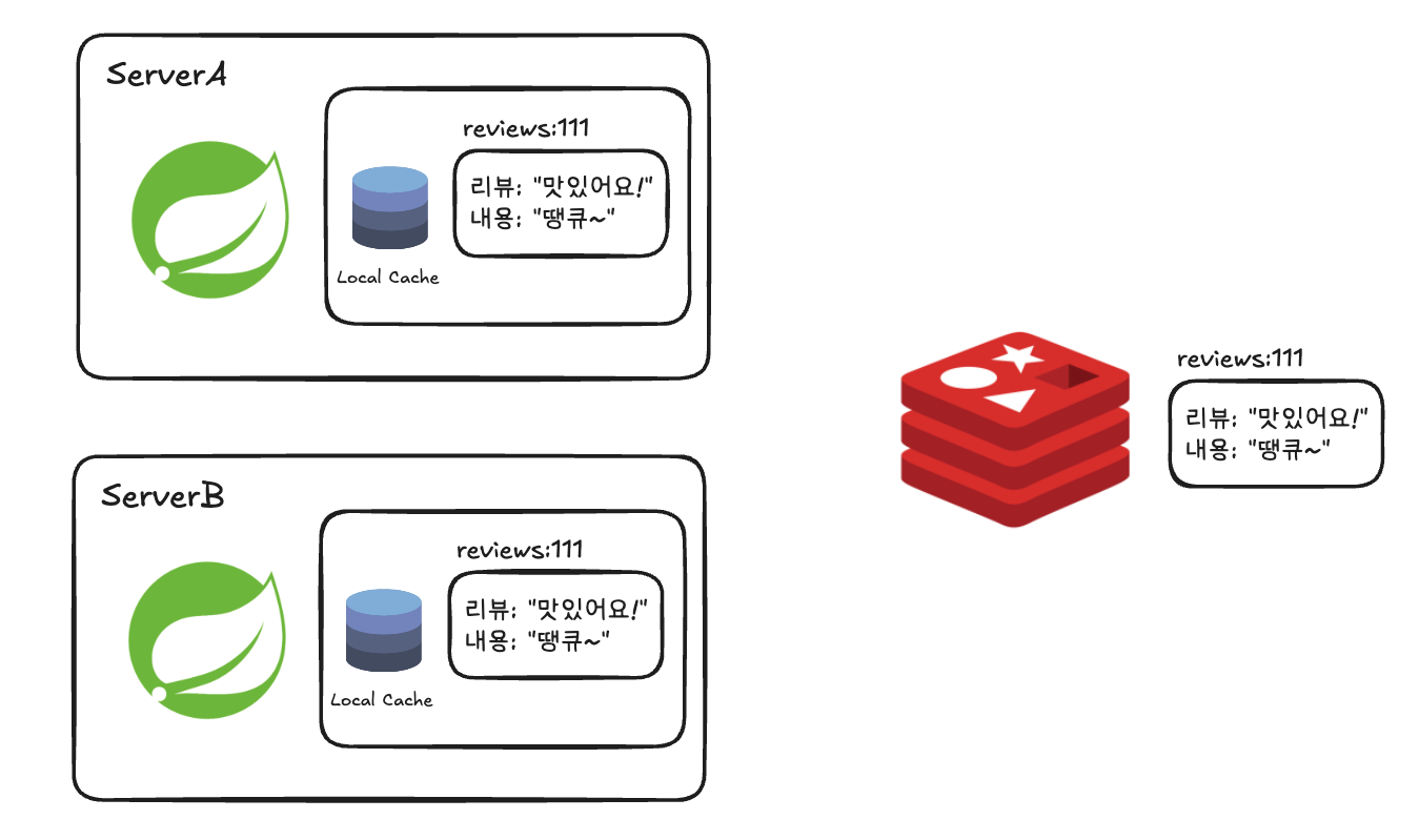 ServerA는 자신의 로컬 캐시를 비우고 새로운 값을 넣었지만, ServerB는 여전히 옛날 데이터를 가지고 있게 된다. 사용자가 어느 서버에 정보를 요청하느냐에 따라 다른 가격 정보를 보게 되는 것이다!