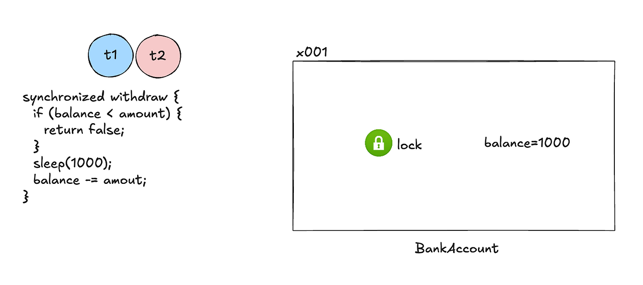 두 개의 스레드(t1, t2)가 동시에 계좌에서 출금을 시도하는 상황을 살펴보자.