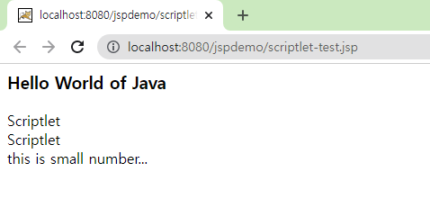 Scriptlet 에서는 내용을 출력하려면 out.println()나 out.print()를 꼭 사용해야하고, 세미콜론(;)도 붙여야하지만