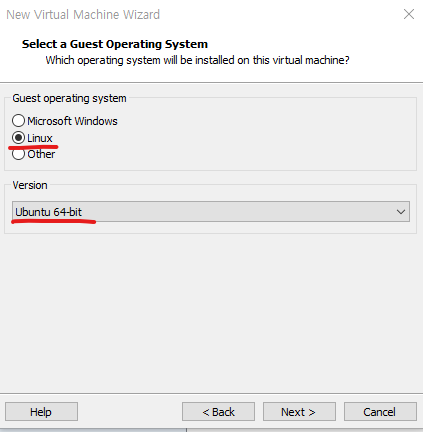 Linux 환경을 실습하기 위해 Linux를 선택해주고 Version은 Ubuntu 64-bit로 설정해준다. 그리고 Next.