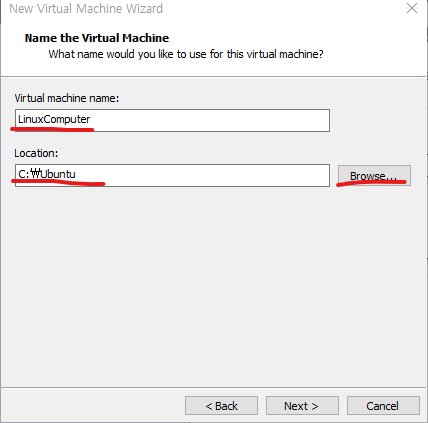 위에 원하는 가상머신의 이름을 설정해주고 Location도 원하는 위치로 정해준다. 그리고 Next.